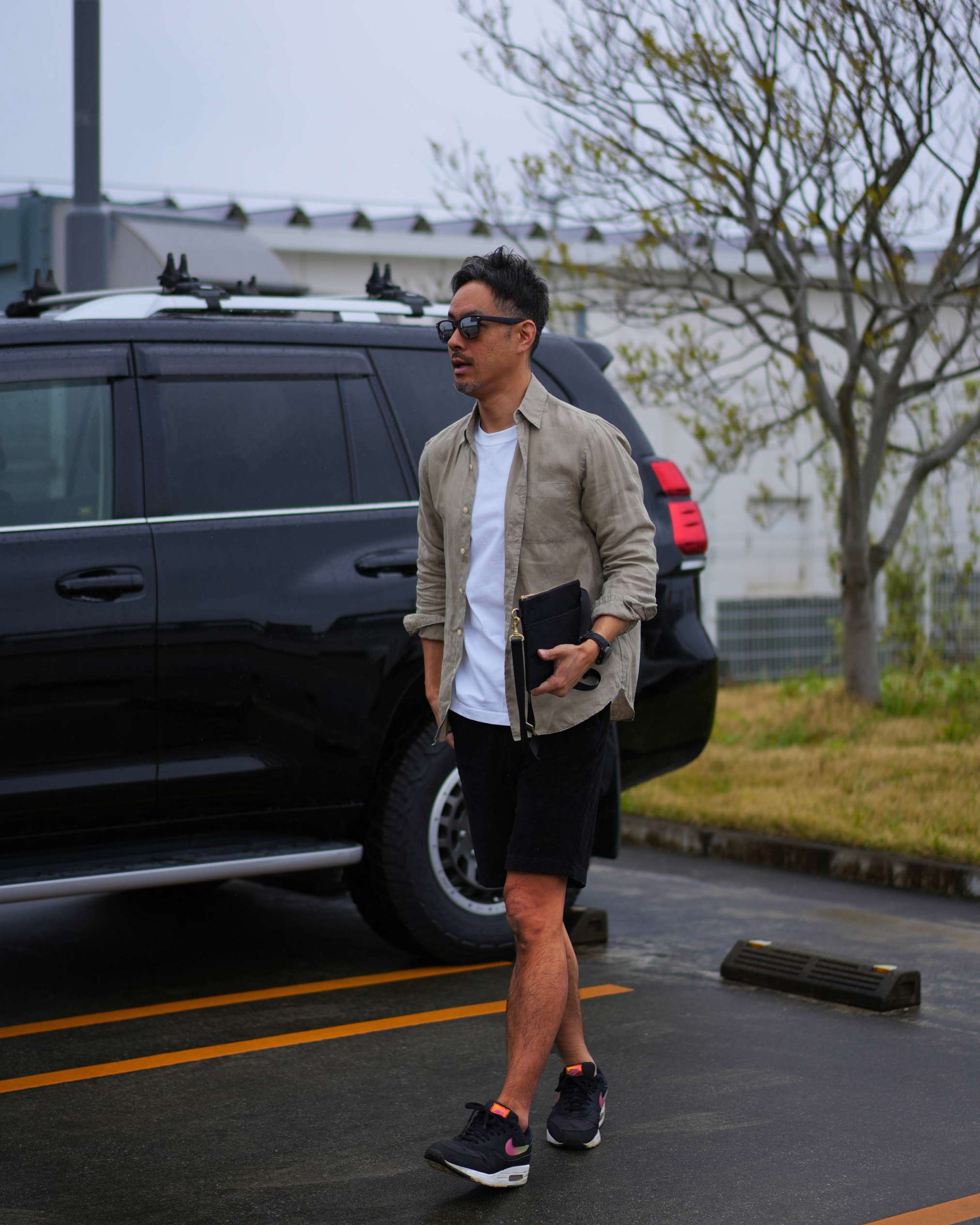 黒の短パンにベージュと白のトップス。合わせやすい定番カラーの組み合わせながら、バラバラの素材のアイテムをチョイスしギャップを楽しむ。