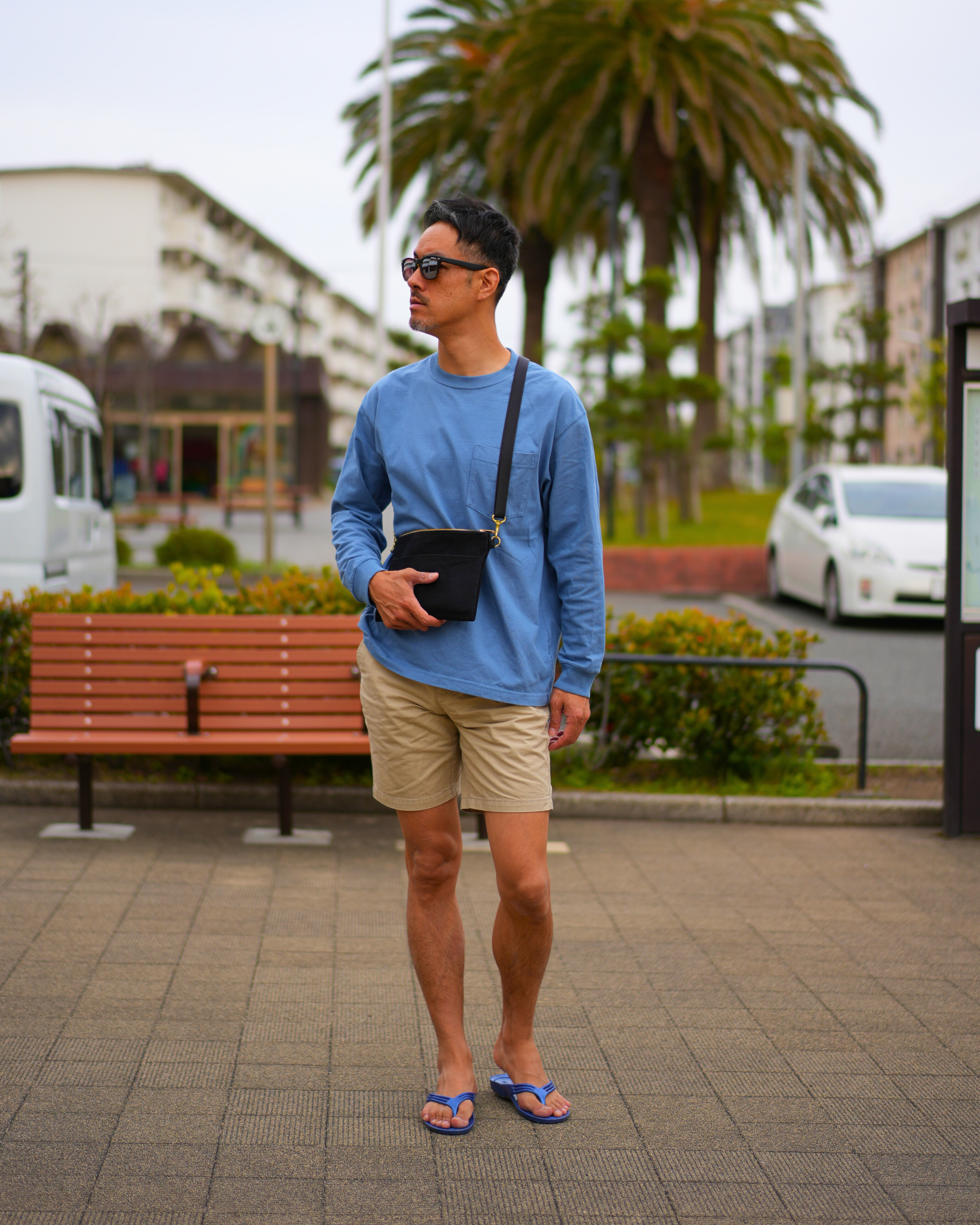 ゆったり目のロンTにヒザ上くらいのチノ短パン。トップスとパンツのシルエットのギャップを楽しむコーデ。