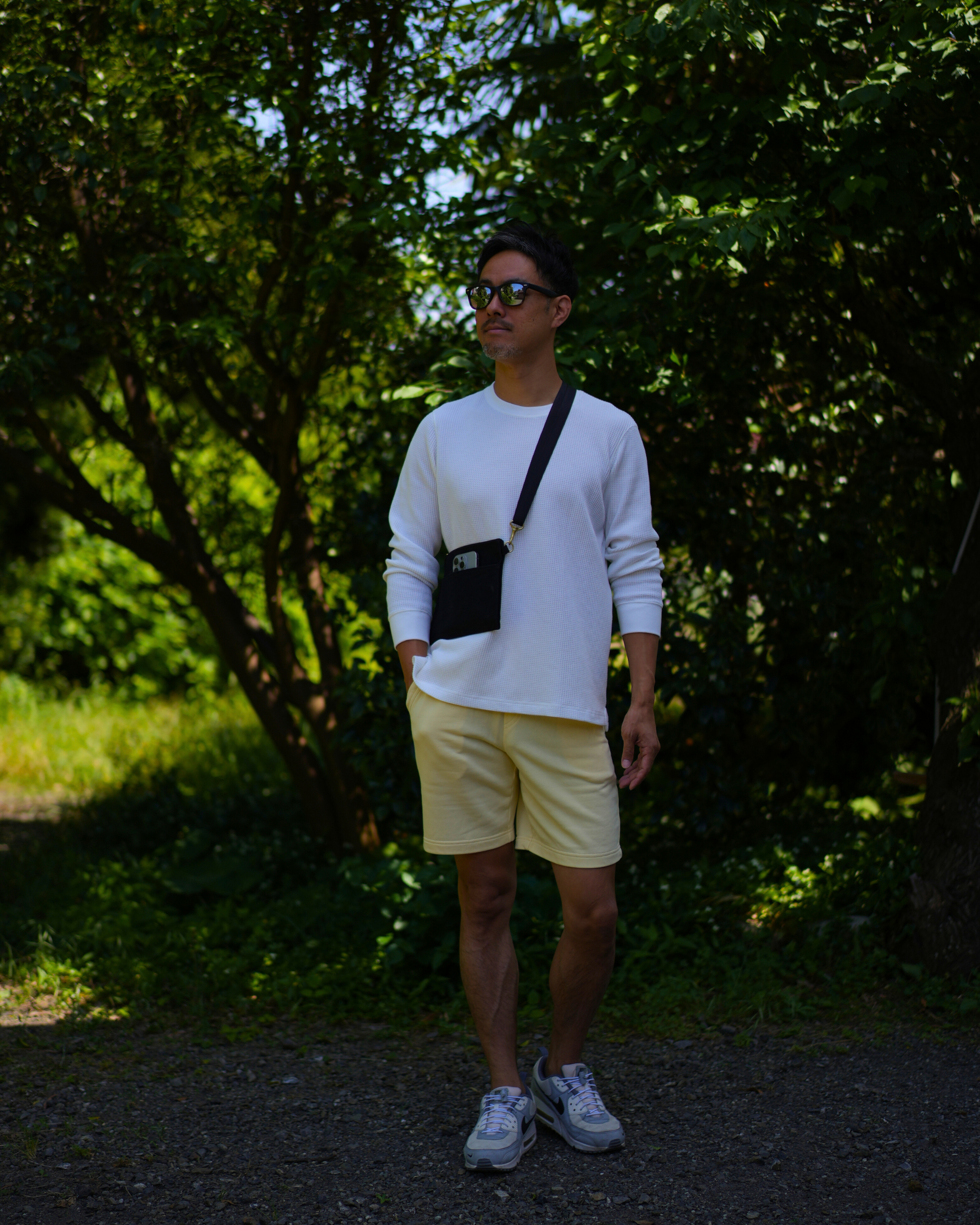白系で淡いトーンの短パン×ロンTコーデ。サコッシュやサングラス等の小物で黒をアクセントカラーに。