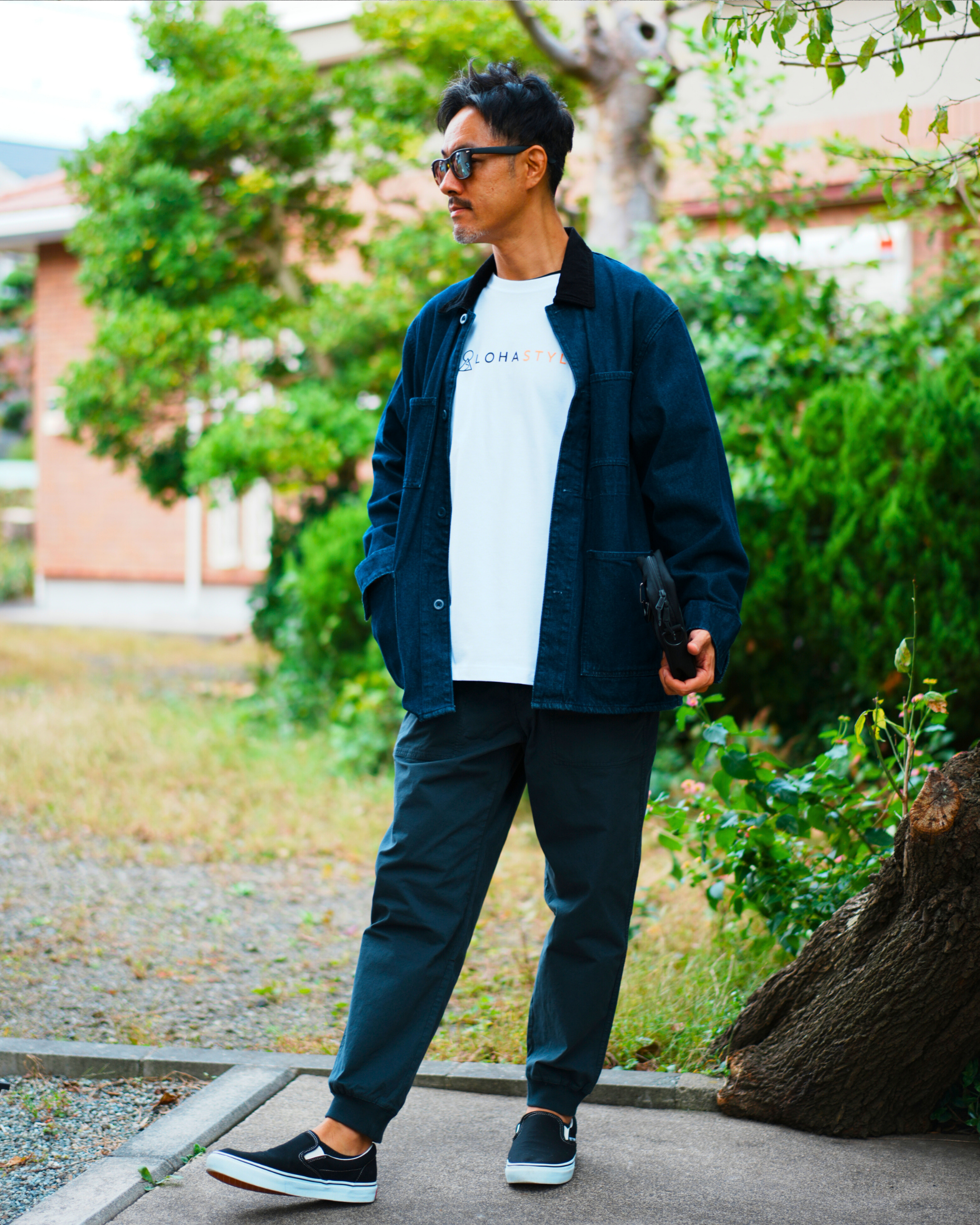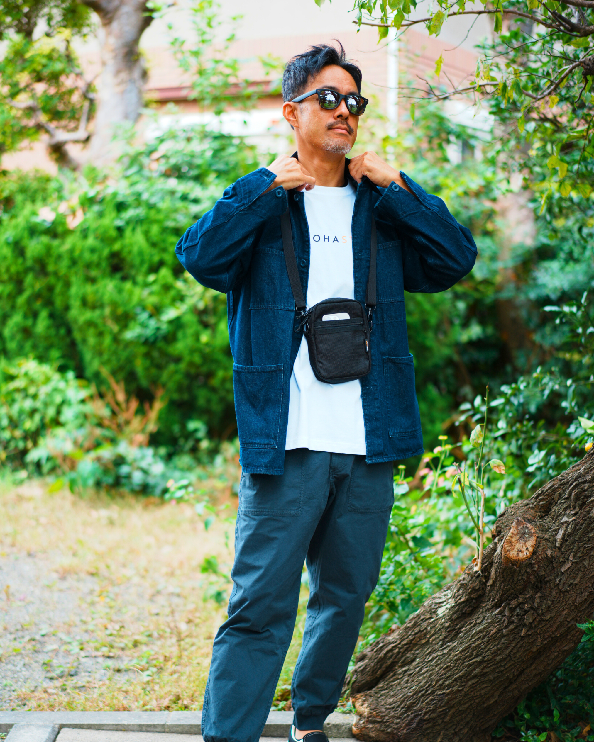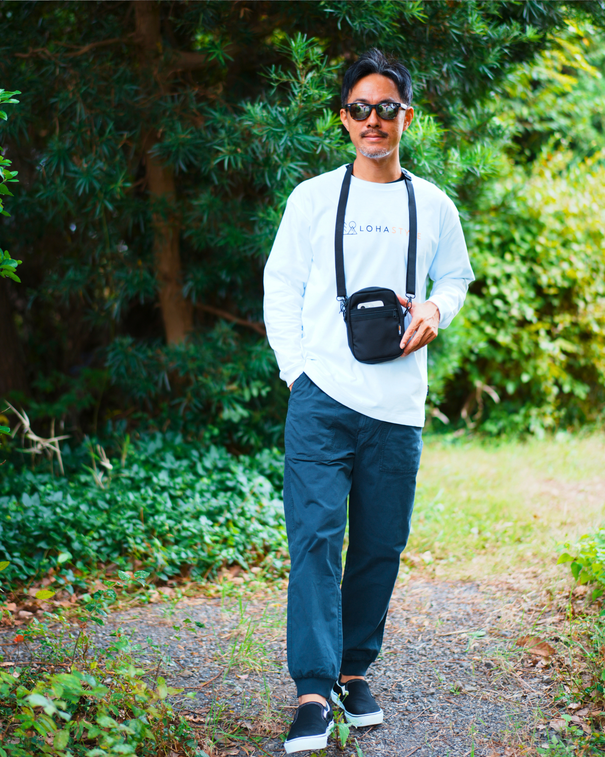 PADDLEポーチはLOHASTYLEのバッグシリーズの中でも最小のポーチサイズとなり、とても汎用性の高いバッグです。そのため合わせるコーデを選びませんが、「耐久性・耐熱性・耐水性に優れるタフなポーチ」という特性から、どちらかといえばラフなコーデにマッチします。