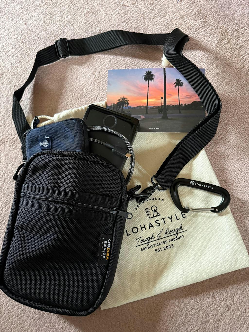 厚手のショルダーベルトは取り外し可能で、外すとポーチとしても使用可能です。付属のカラビナは耐荷重12KN(1200㎏)、アウトドアでも活躍します。